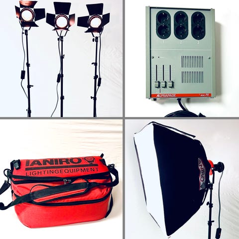 Två dagsljus lampor med softbox 60x60, två stativ, en ljusbox 80x80x80, bakgrunder i olika färger, reservlampor.