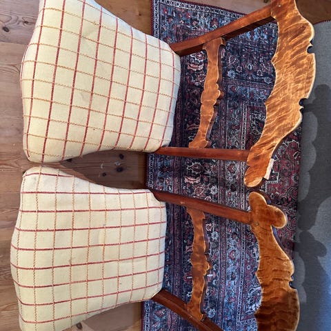 Antika stolar i trä med ny ljus klädsel