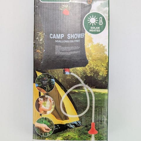 Praktisk dusch från Biltema med uppladdningsbar pump, duschslang och duschhandtag. Dränk pumpen direkt i bäcken, en hink med vatten eller en dunk med tillräckligt stor öppning.