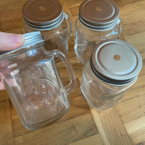 Fin flaska med jordgubbar på. Patentkork. 2 st glas i glas med metallock och sugrör i form av en jordgubbe. Flaskan är ca 31 cm hög och omkrets som bredast 28 cm. Glasen är inklusive bladen 14 cm höga och omkrets som bredast 32 cm. Längd på sugrör ca 31 cm. Kan hämtas på Fridhemsgtan vid Fridhemsplan.