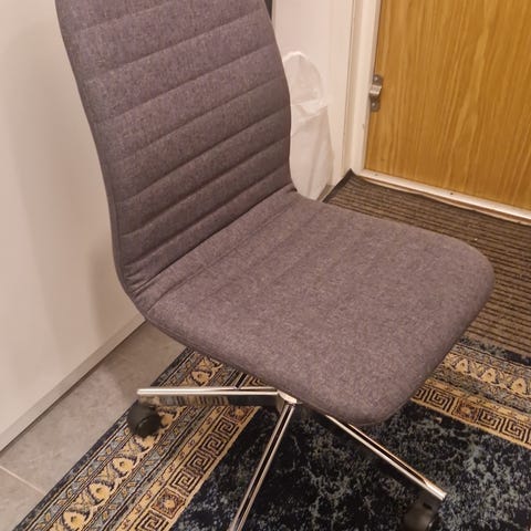 Stolen har hög rygg, sits i gråmelerat tyg och stabil fot i borstad aluminium med hjul. Perfekt för kontor, hemmakontor eller mötesrum.