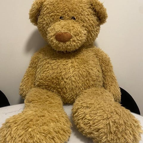 Mjukdjur i form av en nallebjörn med brun päls och en grön rosett runt halsen. Mjukdjuret är cirka 30 cm högt och cirka 25 cm brett. Tillverkat av mjukt material och lämpat som leksak eller dekoration.