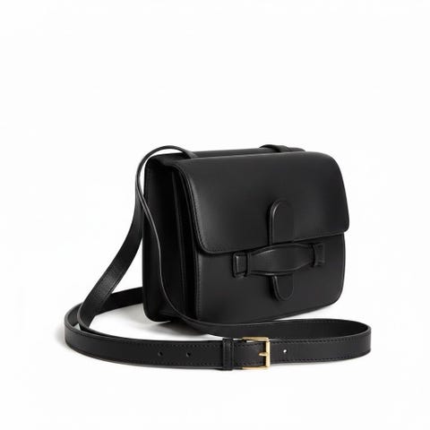 Gucci handväska i svart läder med kort handtag och guldfärgad detalj framtill. Väskan har en slät yta och en kompakt form, lämplig för vardagligt bruk eller formella tillfällen.
