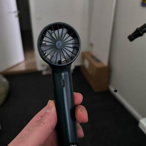 Bärbar nackfläkt i svart färg med justerbar design för att ge svalka vid behov. Produkten är avsedd att bäras runt nacken och har funktioner för att växla mellan kylning och värme.