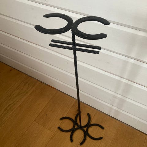 Kommer ifrån en gammal klädaffär där man kunde förvara och enkelt ta ner kläder / galgar från hög höjd utan att använda stege. Trästången är 145 cm lång. Finns i Gustavsberg - Värmdö. Kan skickas utan träskaft.