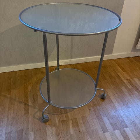 Bord i mörkgrå metall som kan användas som soffbord, rullbord eller sidobord.