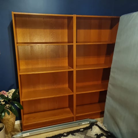 Fina bokhyllor som kan kopplas ihop. Andra bokhyllan med låsbart skåp. Bokhyllorna är ganska tunga.