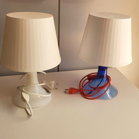 Säljer en bordslampa med en blå bas och en vit lampskärm. Lampan har en röd sladd med strömbrytare. Höjd 30cm och bredd 23cm