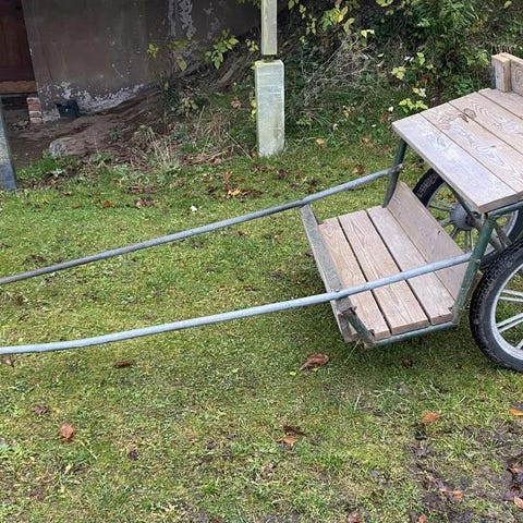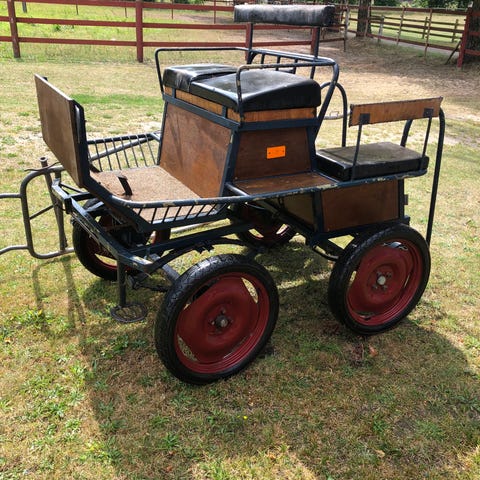 Ponnyvagn säljes. Använd till b-ponny. Vi har inte använt vagnen så mycket och nu har vi inte ponnyn kvar. Längd på skaklar från främre delen av vagnen är 180 cm och bredd mellan skaklar är 80 cm. Det får lätt plats två personer som sitter bredvid varandra i vagnen. Förvarad under tak. Säljes i befintligt skick. Inga större fel men man kan måla lite svart färg på järnet om man vill snygga till den mer. En trevlig vagn för billig peng.