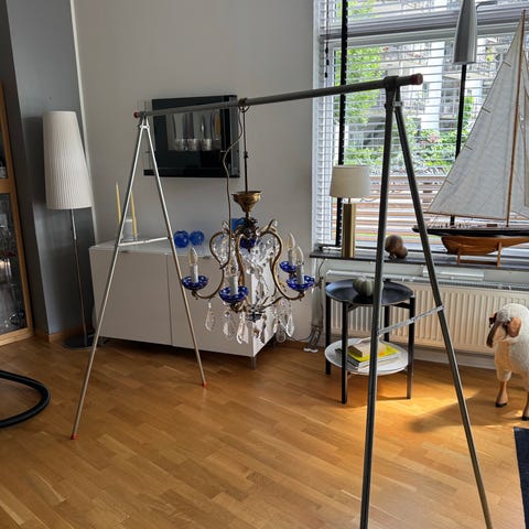 Mått; H=ca 95 cm från taket;Själva lampa h=90; D=ca 60 cm, arm till arm.