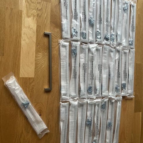 23 st eleganta metallhandtag från Myresjökök, rostfri look. Längd: 23,5 cm - 2 möjliga hålavstånd 19,5 och 22 cm. Skruvar medföljer. Pris 45:-/st (nypris var 140:-/st).