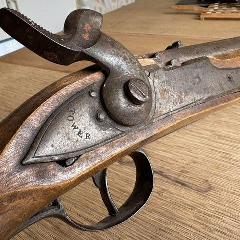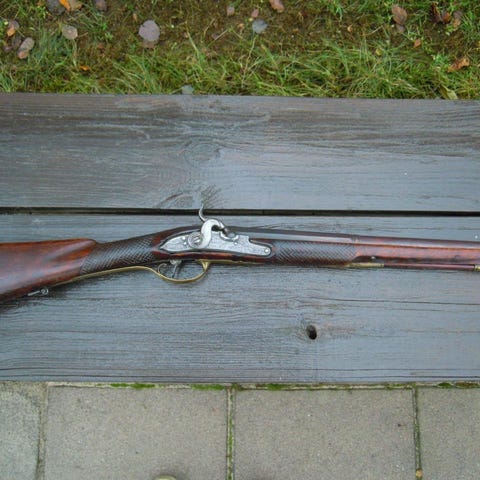 Ett konverterat jaktgevär från flintlås till slaglås med beslag i mässing, av David Metzger. Rendborg i Schleswig-Holstein ca. 1780. Låset med avtryckare, märkt D. Metzger A Rendsburg. ca. 70,5 cm. lång åttakantig pipa i kaliber ca. 19 mm. Räfflad med 16 spår. Av David Metzger 1731-1807. Total längd ca. 108 cm.