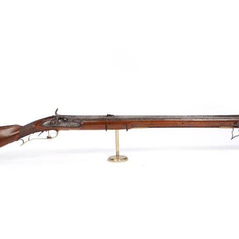 Flintlåskarbin sent 1700-tal, Frankrike, med mässingbeslag, kaliber ca. 16 mm. Hane låser i båda lägen. Laddstake original. Längd ca. 70 cm.