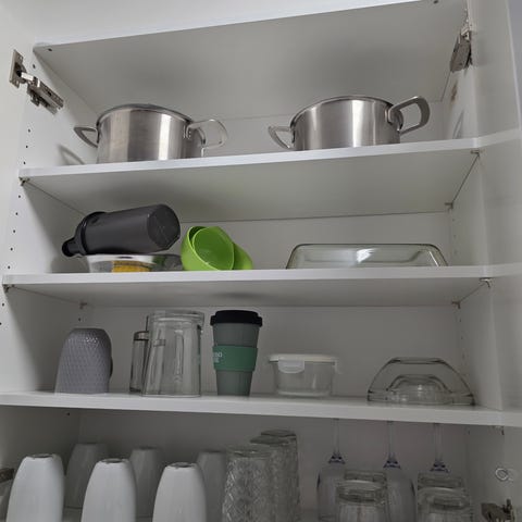 Ett blandat sortiment av köksartiklar. Inkluderar bland annat tallrikar, muggar, bestick, skålar, förvaringsburkar, skärbrädor och andra köksredskap. En Nutriway termosmugg ingår också.