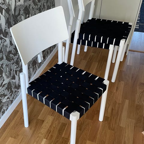 Finaste stolarna. Stomme i ljust trä och svart flätad sits i breda remmar. Använda en kortare period i övernattningslägenhet. Rejäla och av fin kvalité. Tror att de är inköpta på Royal Design men hittar de inte längre. 1100kr/st eller alla fyra för 3600kr
