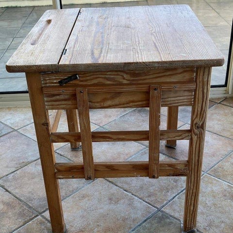 Skolbänk från folkskolan på femtiotalet. Kommer från skola i Löderup. Höjd 73 och måtten 70x53 cm. Ganska bra skick men märken efter glada barn finns naturligtvis. En speciellt möbel. Inte många finns kvar.