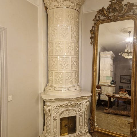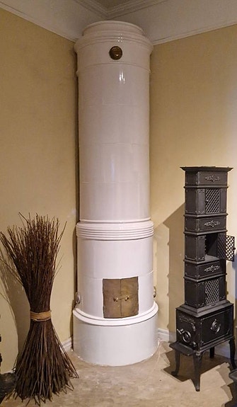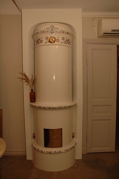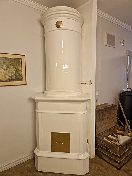 Denna kakelugn är ca 220 cm hög och står uppställd i vår utställning.