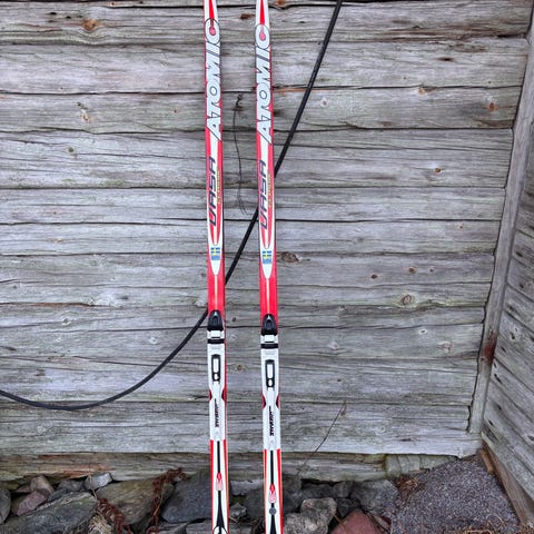 Kult, retro, nostalgi vallaskidor 210 cm. med 75 m.m. Nordic norm bindning, ca. 45 år gamla, hela, fullt åkbara. Matchar veteran bilen på crusing!