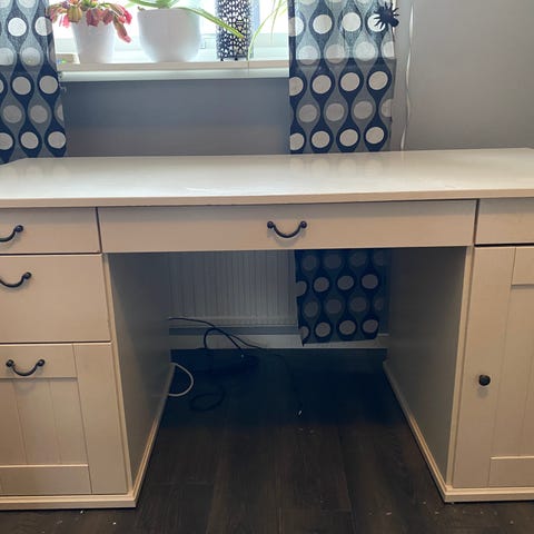 Möbeln är professionellt restaurerad och målad i en ljusgrå kulör, vilket ger den en ljus och modern karaktär utan att tappa sin historiska själ. Passar lika bra som skrivbord, konsolbord eller sminkbord i ett klassiskt eller modernt hem. 5 st riktigt djupa funktionella lådor.