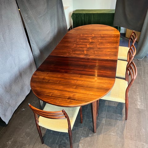 De är tillverkade av C.M Madsens fabriker i Danmark (brännmärkta), tillverkade 50-60 tal. Fantastiskt hantverk där inga skruvar har använts och fina ådringen i eken syns tydligt.
