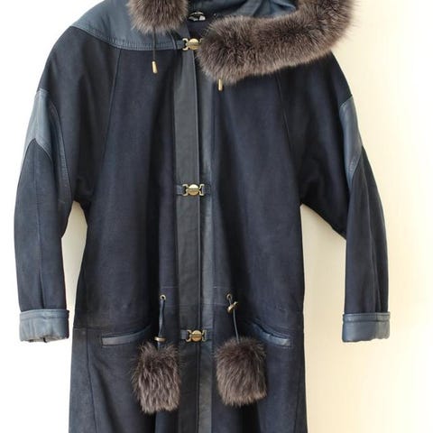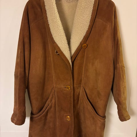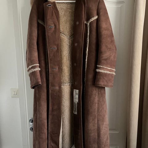 Lång fårskinn kappa från Malung i ljusbrun mocka med insida av fårskinnspäls. har knappar och en innerficka i skinn.