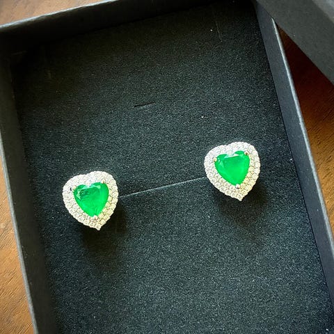 Sagolikt vackra signerade 1950-tals Coro örhängen.Silver pläterade med clips.Med ett större smaragdgrönt kristall hjärta i mitten.Omgivet av vita gnistrande kristaller med Aurora borealis beläggning. Är mörkgrönt hjärta men skiftar i gröna nyanser beroende på ljuset.Fin slipning som gör att de gnistrar och reflekterar ljuset otroligt vackert.