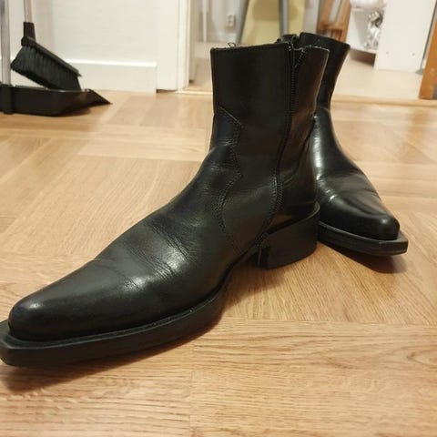 Svarta skinn-boots med snygga detaljer. Dragkedja och stretchtyg gör de lätta att ta av och på.