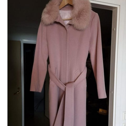 Ljusblå kappa (10% cashmere, 90% ull) med huva som har avtagbar pälskant. Märket är svenska Skinnwille. Mycket sparsamt använd- storlek 36. Nypris ca 6000kr.