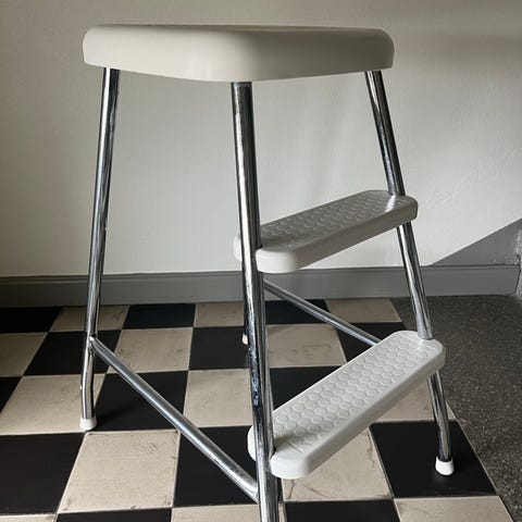 Lätt och stabil fotpall i helsvetsad stålkonstruktion. Fotsteg med halkskyddande material. Perfekt för husvagn, husbil, kök och garage . Vitlackerad.