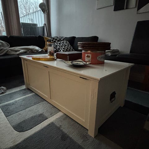 Vitt Boxy soffbord 100x100x43 cm + 4 mörkgrå pallar. Praktiskt set där pallarna förvaras under bordet. Stor yta perfekt för sällskapsspel, pussel eller kvällsfika. Bordets färg börjar släppa i kanterna (se bilder) och kan behöva lack- eller färgfix. Pallarna är i mycket fint skick.