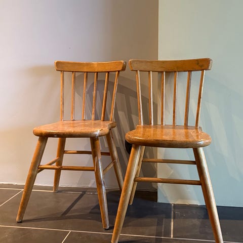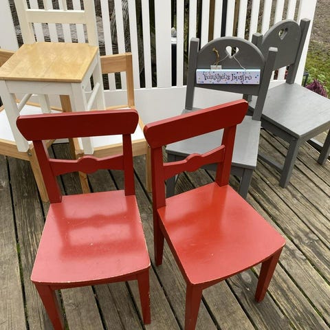 Två barnstolar typ pinnstolar från IKEA. Slitna men helt ok stabila. Behöver en rengöring:) Eller slipa ner dem och få riktigt fina. OBS Notera att pinnen som skall var mellan benen fattas på den ena stolen!
