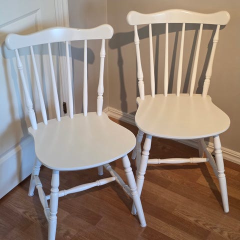 2 ljusgrå pinnstolar med klädd sits