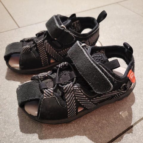 Paxskor, gråsvarta med kardborrknäppning och innesulor i skinn i storlek 24. Hela men använda.