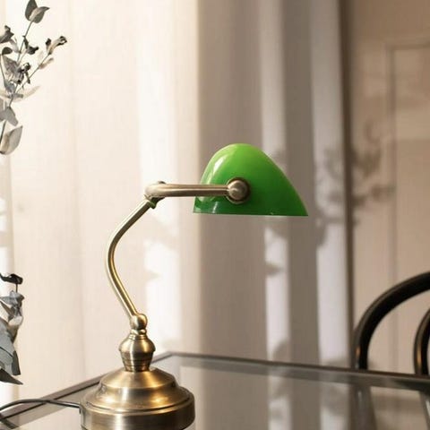 Denna traditionella bankirlampa skulle se ut som en del av alla klassiska arbetsrum eller sovrum och är perfekt som läs- eller arbetslampa. Skärmen lutar upp och ner för att justera ljuset.