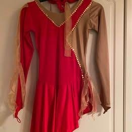 Röd konståkningsklänning som använts vid tävling. Ganska flexibel storlek, men skulle tro att den är gjord för storlek XXS-XS eller barn 10-15 år.