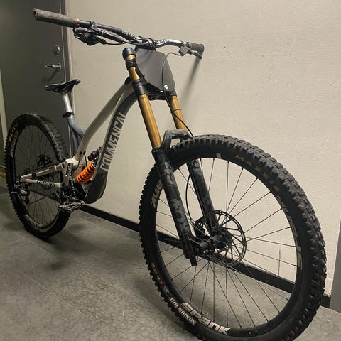 Det är en Trek Session 9.9 carbon 26’’ cyckel size M, som har 200mm luftfjädring både bak och fram. Gaffeln är en Fox 40 och har en Kashima coating. Den har ett Hope bromssystem, som kostade 10’000kr, 203m luftade bromskivor samt ett Leatt nackskydd, Five.Five, ingår. Ett Spank styre som är 80cm bred. Den har en Straitline bashguard och pedaler. Saint växel och cranks.