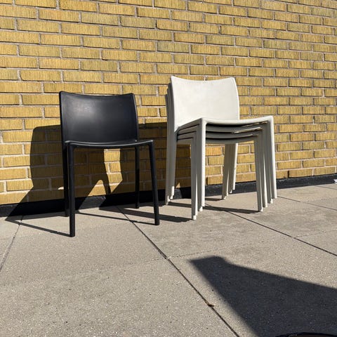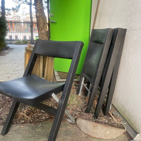 Stolar i någon sorts metall. Gjorda för utomhusbruk. Väger en hel del.