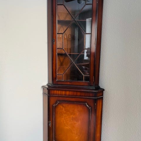 Antikt hörnskåp med handblåst glas