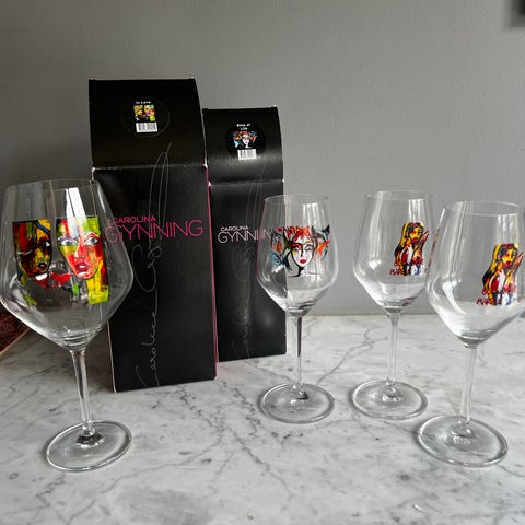 Har nu valt att sälja mina fantastiskt fina Carolina Gynning rödvinsglas då jag vill börja samla på en annan serie. Glasen är endast använda 1-2 gånger och är i fint skick. Alla glasen har originalförpackingen kvar. Jag har nu 8 st glas kvar. De som är överstrukna med ett rött kryss finns ej kvar. Fler bilder kan fås om man vill se närmre på något specifikt glas.