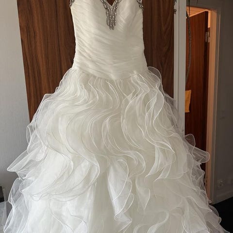 Klänningen är mycket vackert broderad och har en elegant snörning i ryggen. Klänningen är i storlek 36 men är möjlig att justera uppe vid bysten. Det finns även axelband som man kan välja om man vill använda.