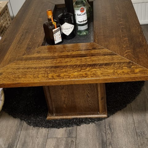 Massiv skiva av al. Underrede saknas till detta soffbord. Oljad yta. Skador som går ganska djupt(se bild) men kan slipas ner då skivan är ca2,25 cm tjock. Spricka.