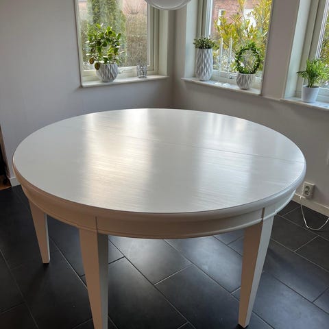 Säljer vårt matrumsbord som vi använt som köksbord. Det är ovalt (tror inte det finns att köpa mer) och köpt hos Mio. Det finns lite små märken men inte så mycket. Väldigt lätt att måla om för den som vill och kan.