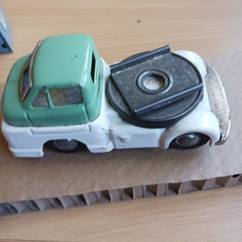 1: Polisbil, Ichiro, 1950-talet, Japan (taksökare lös) =600kr 2: Lastbil, Trada, 1950-talet, Japan =700kr 3: GMC Airforce transport truck, 1953, Haji, Japan =900kr 4: Buss Airporter, 1950-talet, Shioji, Japan (liten skada över framrutan) =500kr Alla fyra =2500kr
