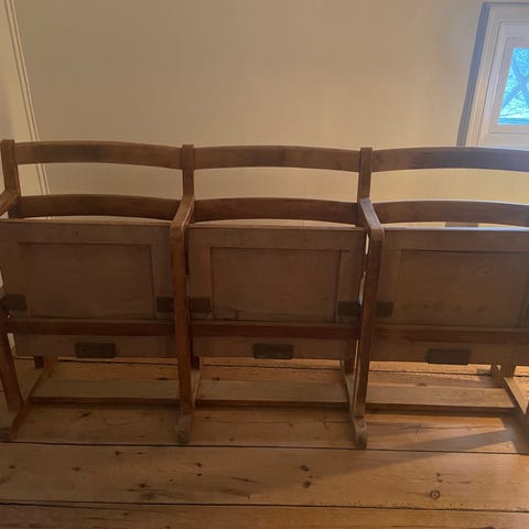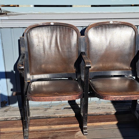 Antika biostolar i brunt trä från 1950-talet. Köpta på Olsson & Jensen. För 5000 kr.