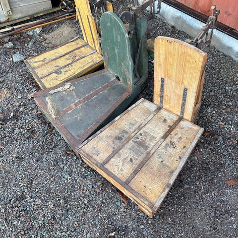 Antika biostolar i brunt trä från 1950-talet. Köpta på Olsson & Jensen för 5000 kr.