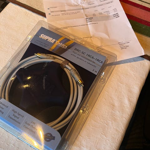 Har en uppsättning Supra Stereo Mini Plug 2xRCA Audio Cable på 8 meter, Den är mycket måttligt använt och i perfekt skick.