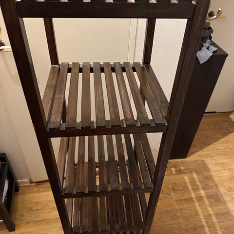 Två stycken likadana som på bilden, dvs fyra st hyllplan med två mittenkonsoller. I mycket fint skick.