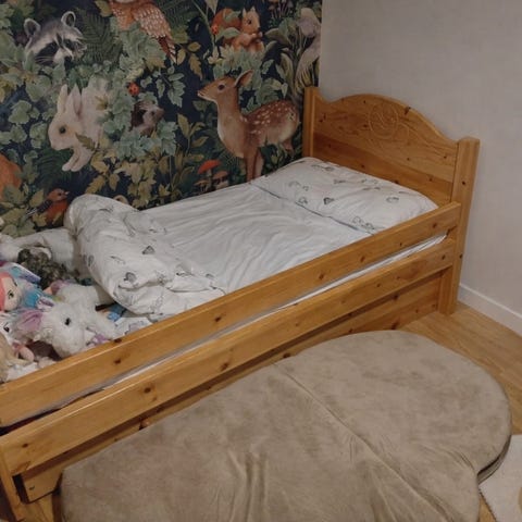 Fantastisk fin säng i design som passar de flesta hem. ritad av intedningsarkitekt och gjord av möbelsnickare. Framtagen för showroom för inredning och därefter används privat till 1 barn . Passar med madrass 200x105-110cm. (följer ej med) Totalt är sängen ca 220x 112cm
