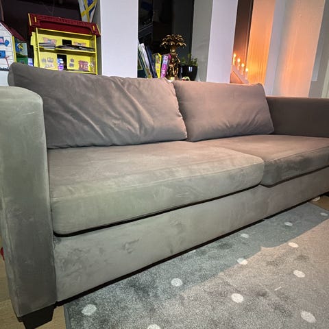 En bekväm och stilren rosa soffa som passar perfekt i vardagsrummet eller gästrummet. Kan stå mitt i rummet. Köpte länge sedan för 23 000 kr på inredning butik, nu är fortfarande fin skick men vill köpa iställer stor soffa.