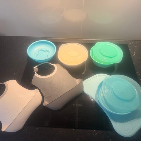 Twistshake tallrik med lock samt Babybjörn middagsset i ljusblått. Sparsamt användt.